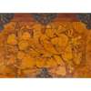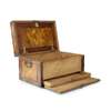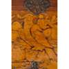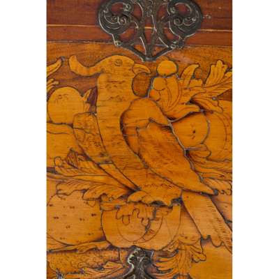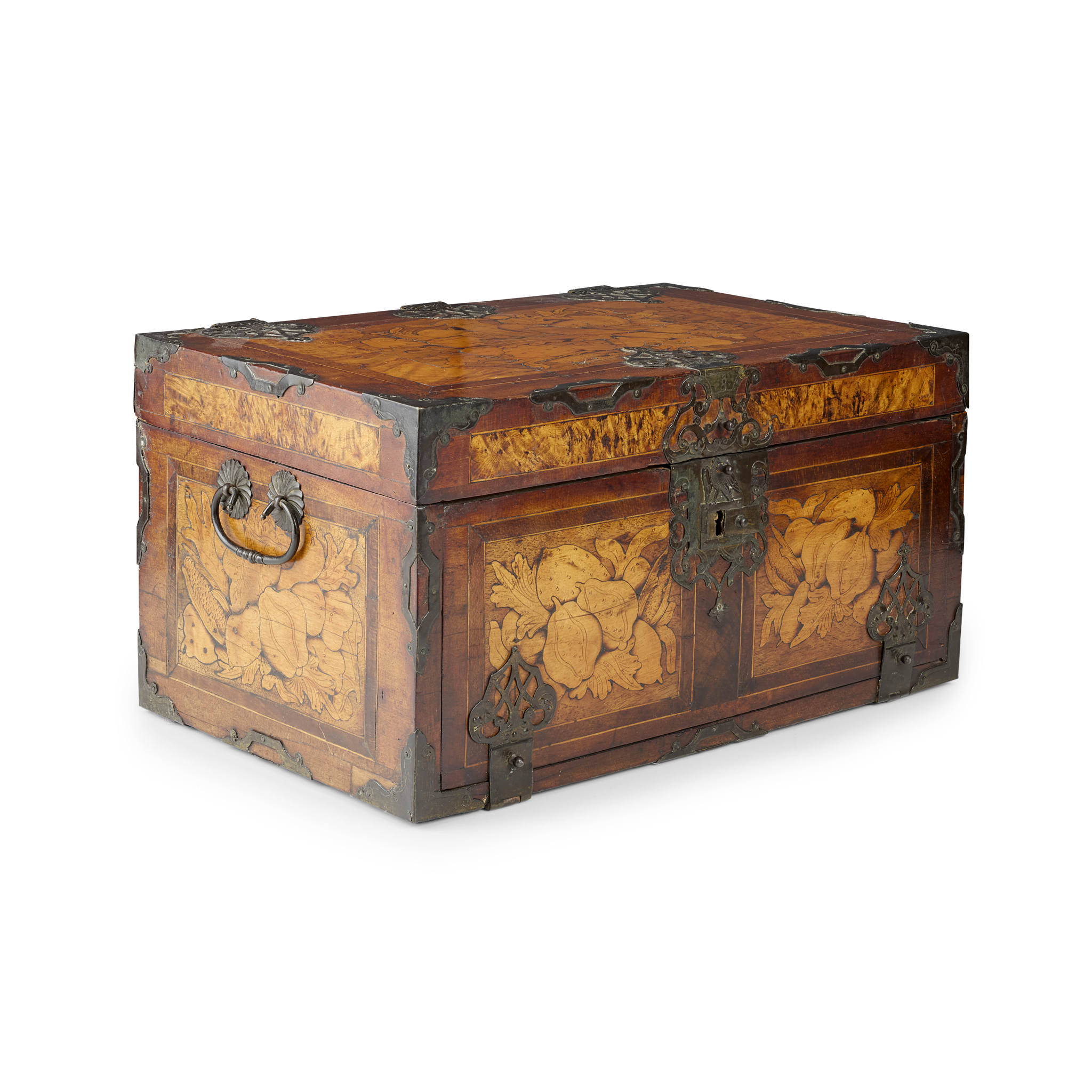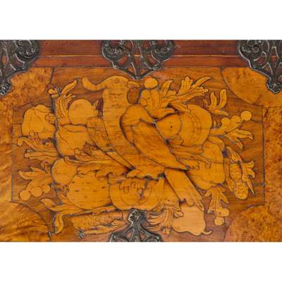 the hinged lid and front with strapwork mounts and a pierced lock and hinges, with marquetry panels of fruit enclosed by burrwood and fruitwood banding, set with a pair of swing handles, the interior with a compartment to the lid and a fall front revealing a lower drawer