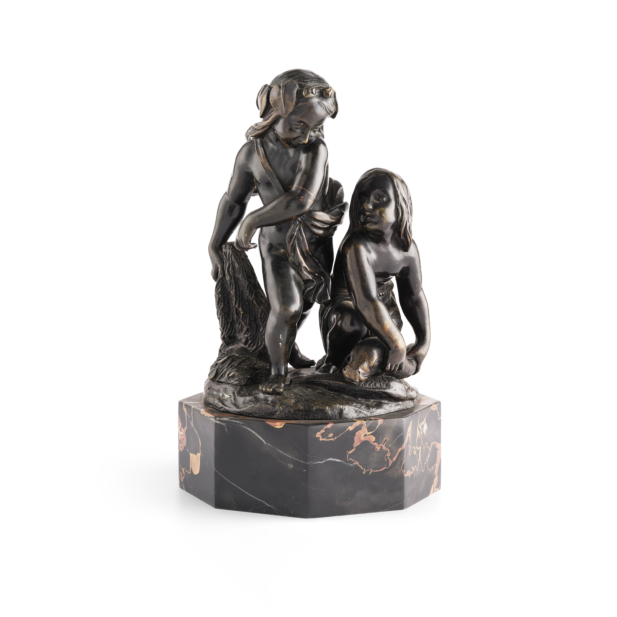 modelled as two putti holding a net and two dolphins on a naturalistic base, mounted on an octagonal portoro marble plinth