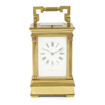 the white enamel signed dial with Roman numerals, the Anglaise Riche case with five bevelled glass panels flanked by fluted Corinthian three quarter columns, the top with swing handle and a push button repeat, of a stepped plinth base on block feet, the twin train movement with silvered platform level escapement striking to a coiled steel gong, the backplate stamped ‘W.M&Co’ and numbered ‘3694’