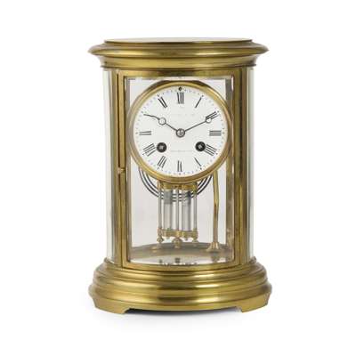 FRENCH BRASS OVAL FOUR GLASS MANTEL CLOCK