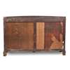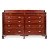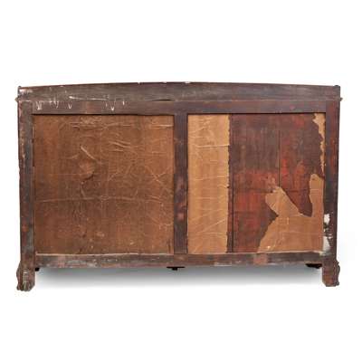 the hinged top with a gallery rail to the back, over a frieze with shell inlay and four dummy drawers, and four further short drawers, on ogee bracket feet