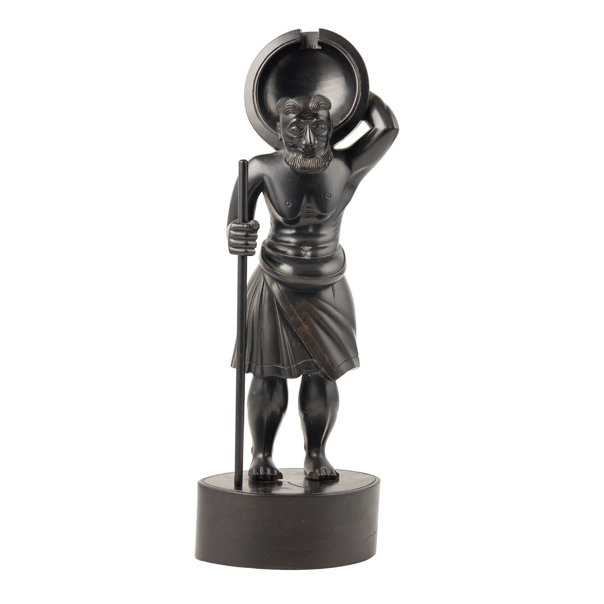 the figure standing with a cloth wrapped round his waist, with a walking stick and carrying an alms bowl on his shoulder, on an oval plinth base
