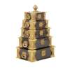 pyramid of five graduated boxes, the top box with a berry finial, the corners mounted in gilt metal and the sides flanked by swing handles, the interior hinges in white metal