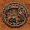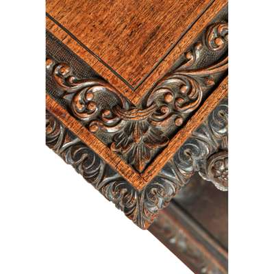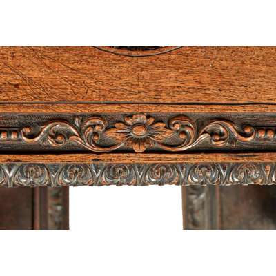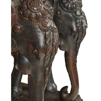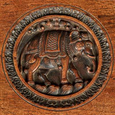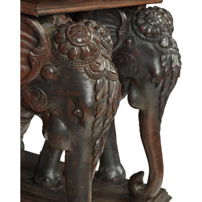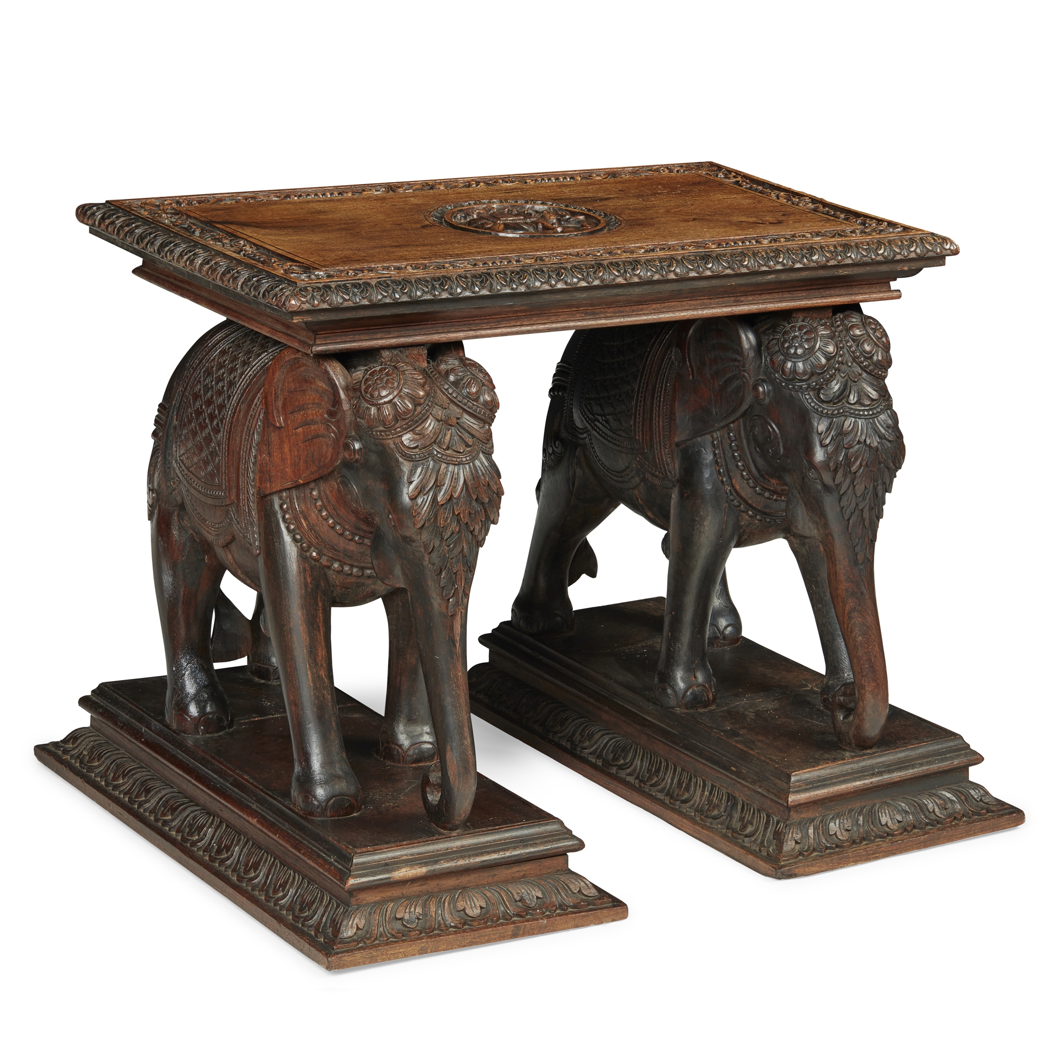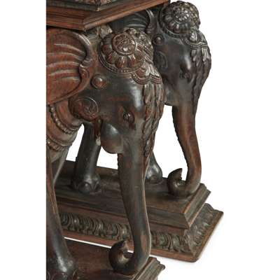 the rectangular top with a leaf carved border and centred by a carved elephant roundel, supported on a pair of carved elephants on rectangular leaf-carved plinths