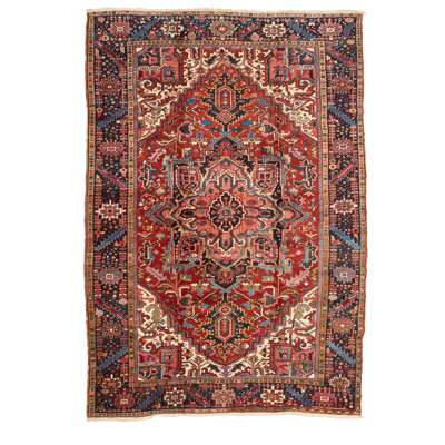 the red field with indigo and salmon pink star medallion, ivory and pink spandrels, within an indigo border