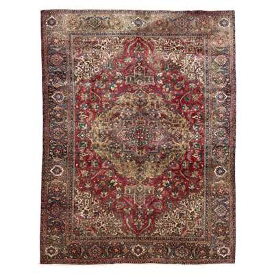 the red field with brown, grey and pink medallion, ivory and pink spandrels, within a grey border