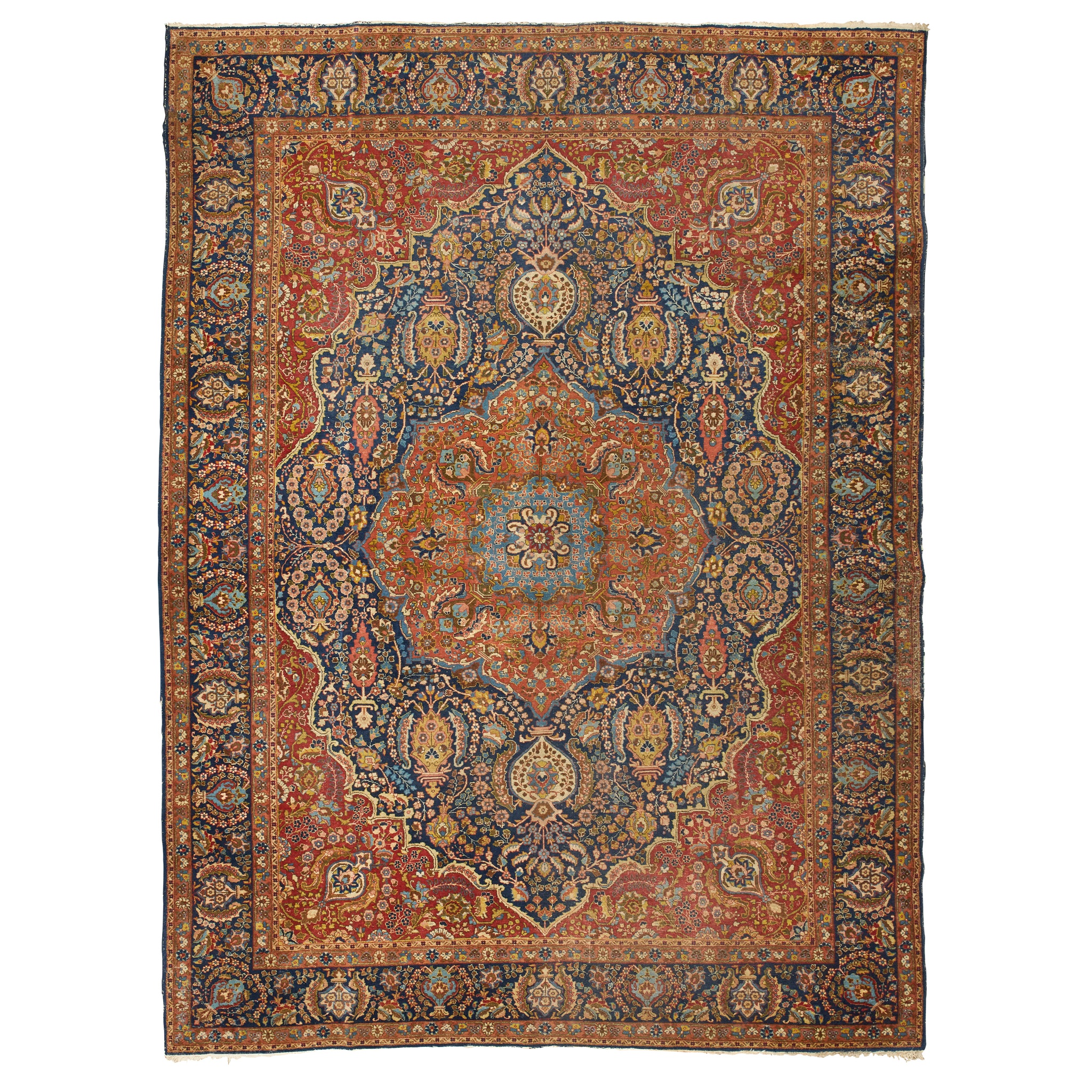 the indigo field with rust red and blue medallion, rust spandrels, within an indigo border