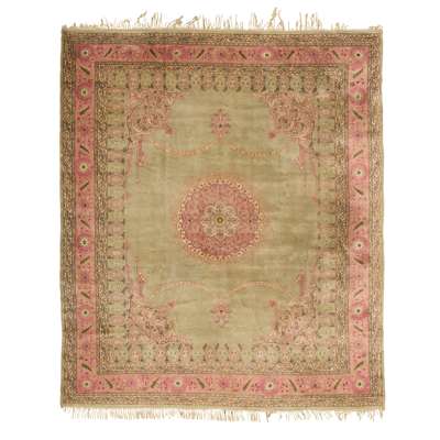 the olive green field with pink and light blue circular medallion, scrolling arabesque spandrels, within a pink border