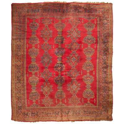 the red field with five columns of palmettes and cruciform motifs, within blue grey border