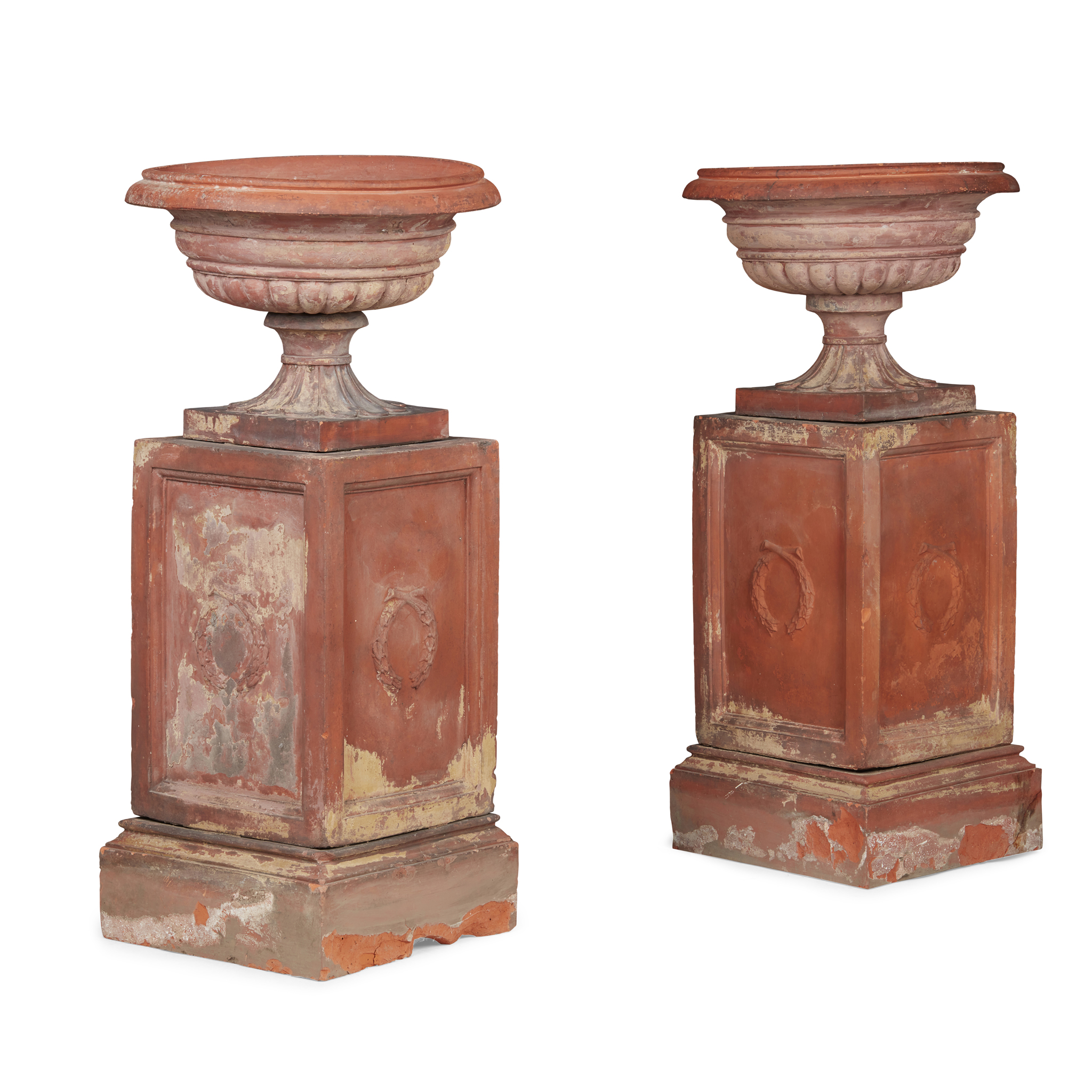 PAIR OF TERRACOTTA URNS AND PEDESTALS