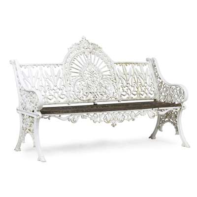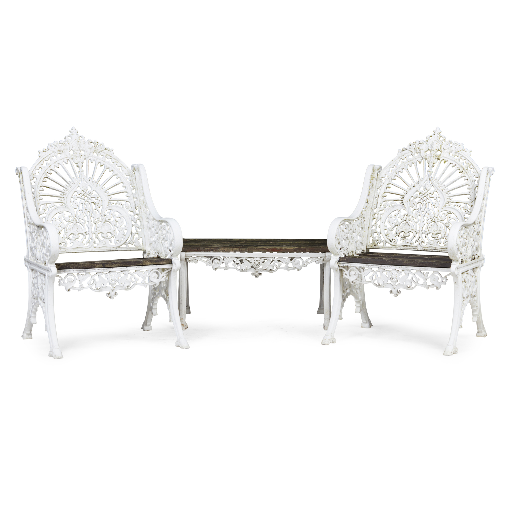 SUITE OF COALBROOKDALE STYLE 'PEACOCK' PATTERN PAINTED METAL GARDEN FURNITURE