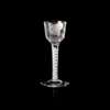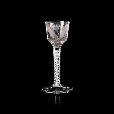 the ogee bowl engraved with a ten petal rose and a bud issuing from a thorny stem, also engraved with a thistle and leaves issuing from the same stem; on an opaque twist stem, and round conical foot