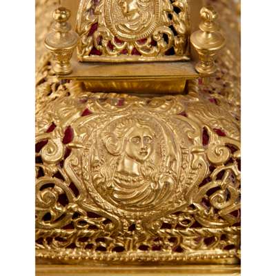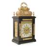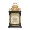 the 7-inch square brass dial with a silvered chapter ring with Roman numerals and engraved Arabic five minute markers, winged cherub spandrels, signed 'Fran. Reynolds, Kensington' above to the top of the plate flanked by foliate engraving, matted centre with two winding holes, blued steel moon hands, the case with pierced repousse double basket top surmount with a twin caryatid cast handle, the upper tier with a profile mask flanked by putti, the lower tier with relief panel of St. George slaying the dragon within a putti and scroll decorated field, above rope twist and beaded ogee moulded lower border, flanked by brass flambeau urn finials to the angles, double-ogee top mouldings above a glazed door with gilt brass mounts to all rails repeated on the reverse, the sides inset with gilt repousse work framed silk-lined sound frets and raised on block feet, the twin fusee movement with anchor escapement striking to a bell