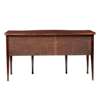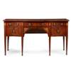 the crossbanded top above a central drawer and arched opening with fan inlaid corner brackets; flanked by drawers to either side, raised on line inlaid square tapering legs headed by fan medallions and ending in spade feet