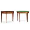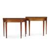 in the Sheraton style, the D shaped tops outlined with satinwood banding opening on double gatelegs to green baize lined playing surfaces, above friezes with brass line inlay, raised on square tapered legs with further brass line inlay and ending in block feet (2)