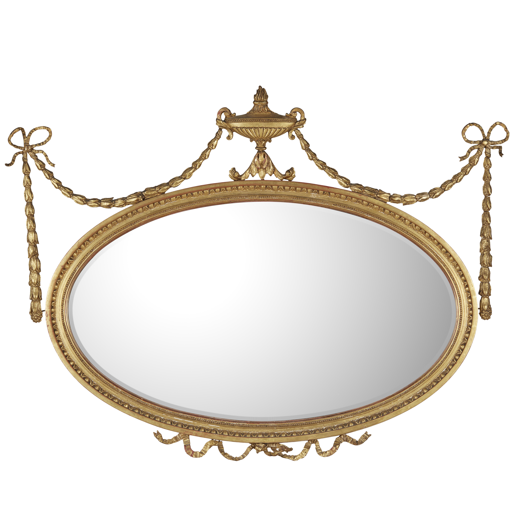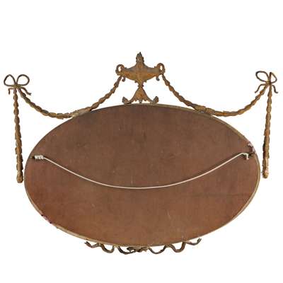 the oval mirror plate within a carved frame surmounted by an urn and swags