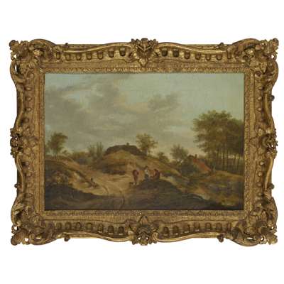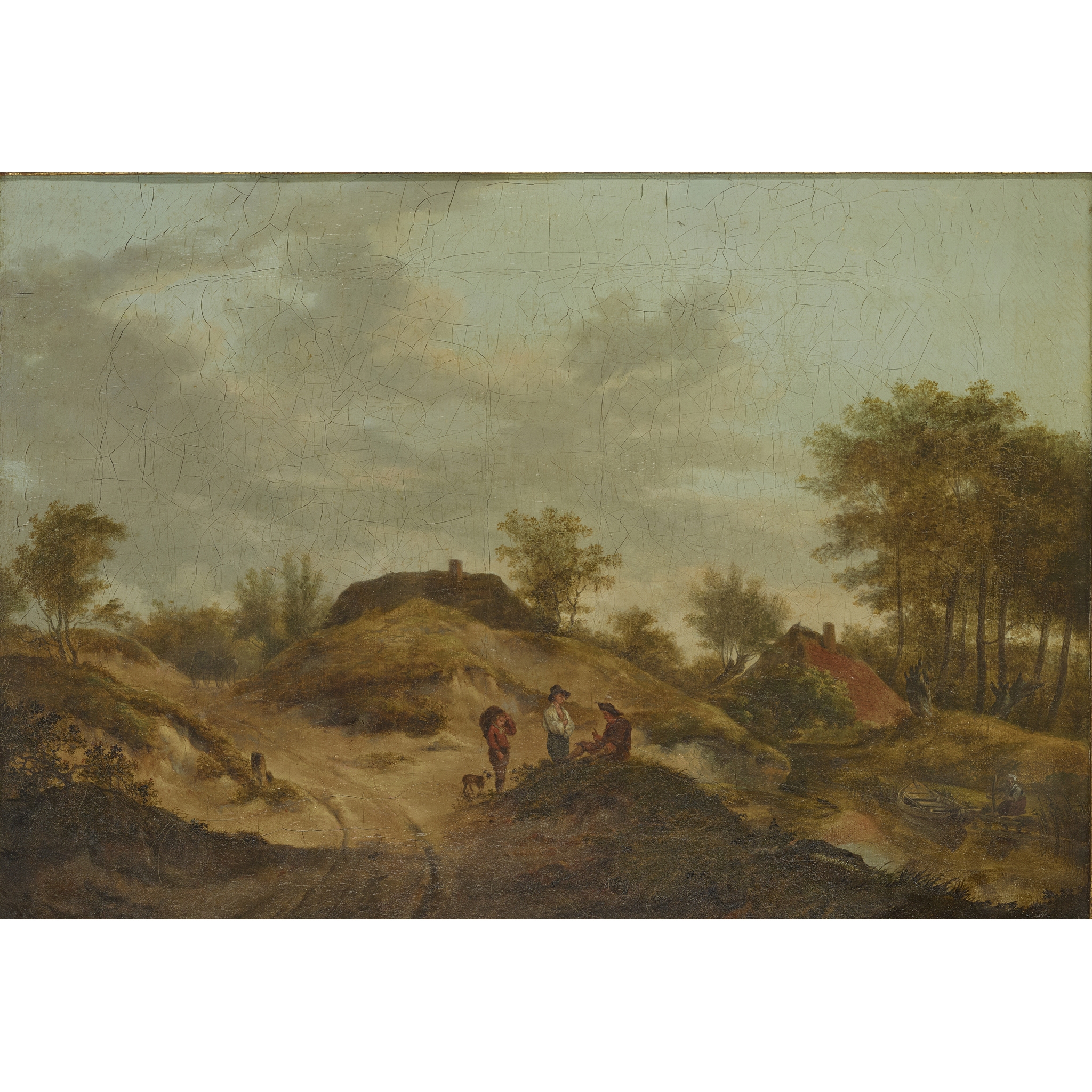 A WOODED LANDSCAPE WITH FIGURES ON A PATH