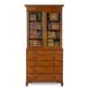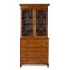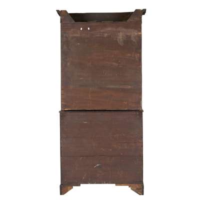 the dentil cornice above a pair of astragal glazed doors enclosing adjustable shelves; the lower section with a double fall front drawer enclosing a fitted interior with pigeon holes, small drawers, a central cupboard door and an inset tooled green leather writing surface, above three long graduated drawers, raised on bracket feet