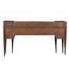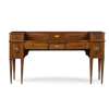 of shaped bowfront outline with a stageback platform, above a pair of frieze drawers centred by a marquetry shell oval roundel, flanked by a deep drawer and a single cupboard with pull out drawers with brass ring handles with rosette backplates, raised on square tapering legs with spade feet