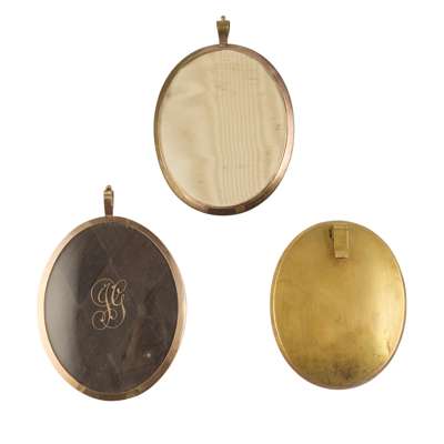 all of oval form, watercolour and body colour on ivory, to include a portrait of a young lady with loose dark hair in a partial turban, wearing a white striped dress, in a rose gold frame with suspension loop, the reverse with a woven hair knot and initials JG; a portrait of a young lady with light brown hair with double bandeau, wearing an open frilled collar chemise with blue sash, in a gilt metal frame with a loop to the back; and a portrait of a young woman with grey hair and yellow bandeau, wearing a triple strand of pearls and white frilled open collar chemise with yellow ribbon (3)