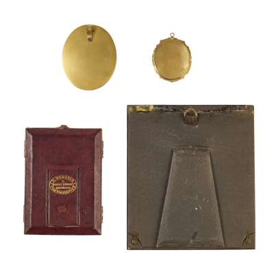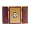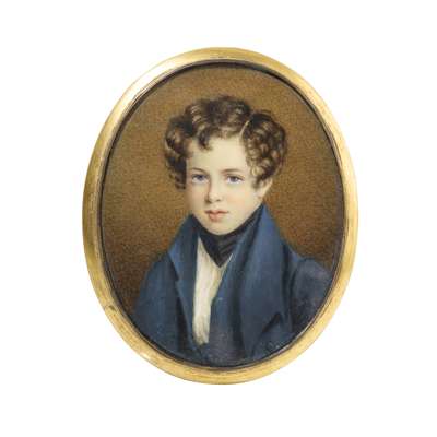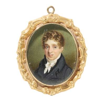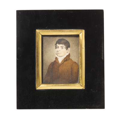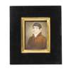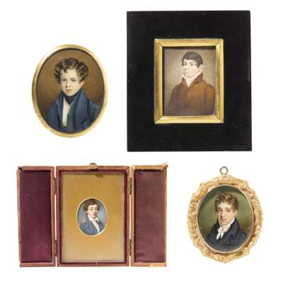 all watercolour and body colour on ivory, to include a rectangular portrait of a boy with dark hair wearing a brown jacket and ruff collar, in an ebonised easel frame; an oval portrait of a boy with wavy brown hair, wearing a blue jacket, white shirt, and black cravat, in a gilt metal frame with a loop; an oval portrait of a young man with light brown hair wearing a blue jacket and white shirt with a high open collar, in a gilt mount and rectangular leather case; and an oval portrait of a young man with auburn hair wearing a black jacket and white cravat, in a rococo gilt metal locket frame, in a small red Morocco leather case (4)