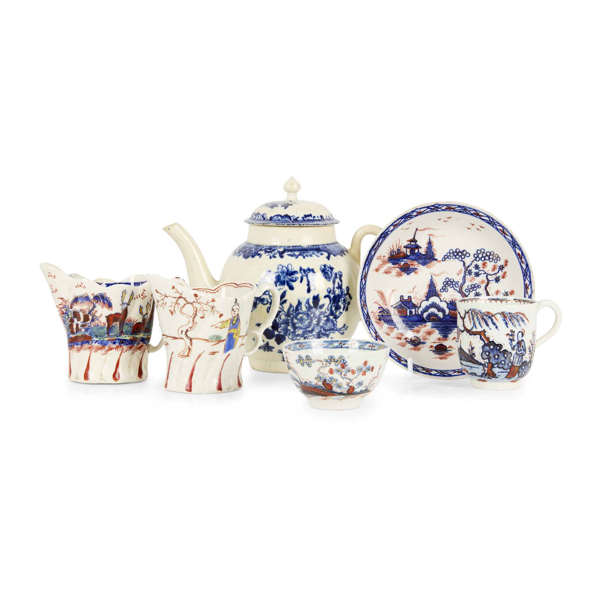 comprising two jugs of Chelsea ewer form moulded with acanthus leaves, one with polychrome chinoiserie decoration, the other depicting stags within a rural setting, with underglaze blue and overglaze red and gilt decoration; a John Pennington coffee cup with underglaze and overglaze decoration; and a similar Doll's House, Rock and Trees teabowl and saucer; together with a globular TEAPOT, probably Liverpool, with underglaze blue floral decoration; unmarked (6)