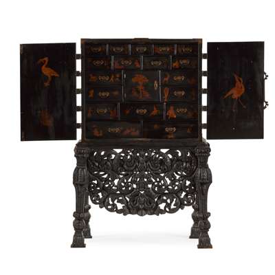 QUEEN ANNE BLACK JAPANNED AND GILT DECORATED CABINET-ON-STAND