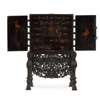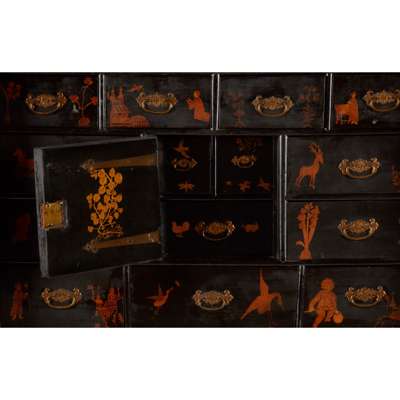 the cabinet with a pair of doors decorated with birds and pavilion vignettes, opening to an arrangement of short drawers and a central cupboard enclosing further drawers, all decorated in gilt depicting various figures, birds, animals, and plants, on a baroque style pierced foliate carved stand