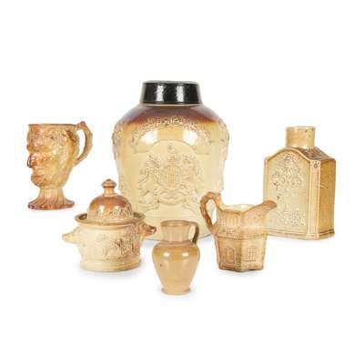 comprising a Brampton ‘Bacchus’ mug and a Brampton jug modelled as a house with a crabstock handle, unmarked; a cylindrical jar with a domed cover, possibly Bramald, the body moulded with sheep and lambs, with twin handles modelled as dog heads, unmarked; a Bridden tea canister moulded with scrolls and masks and impressed ‘Black Tea’, impressed S & H Bridden; a pharmacy jar moulded to one side with the Royal Coat of Arms, flanked by lions and sprays of flowers including rose, thistle and shamrock, with a metal cover; and a small ewer of ovoid form with a strap handle (6)