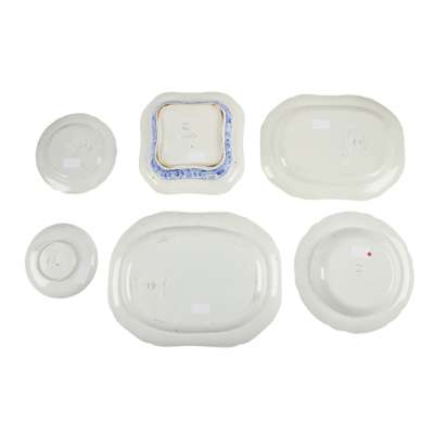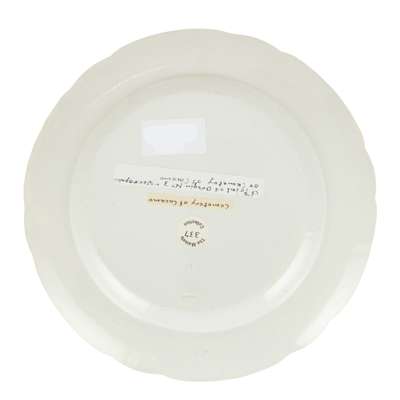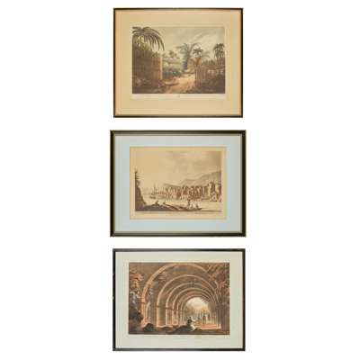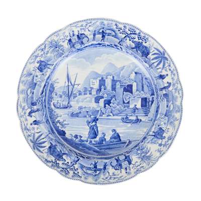 comprising a trembleuse saucer and a plate printed with ‘Ancient Bath at Cacamo’, with a framed print entitled ‘An Ancient Bath at Cacamo in Caramania’, L. Mayer, Published by R. Bowyer, Pall Mall, 1812; a square vegetable tureen (cover lacking) printed with ‘The Principle Entrance to the Harbour at Cacamo’; an oblong ashet printed with ‘Necropolis at Cacamo’ and a plate printed with ‘Cemetery at Cacamo’, with a framed print entitled ‘Necropolis or Cemetry of Cacamo’, by L. Mayer, Published by R. Bowyer, Pall Mall, 1803; a soup bowl printed with ‘City of Corinth’; and an oblong dish printed with ‘Ancient Temple near the City of Corinth; with a print entitled ’A Tiger Prowling Through a Village', Sam Howitt, Published by Edward Orme, 59 Bond Street, London; various printed and impressed factory marks (10)