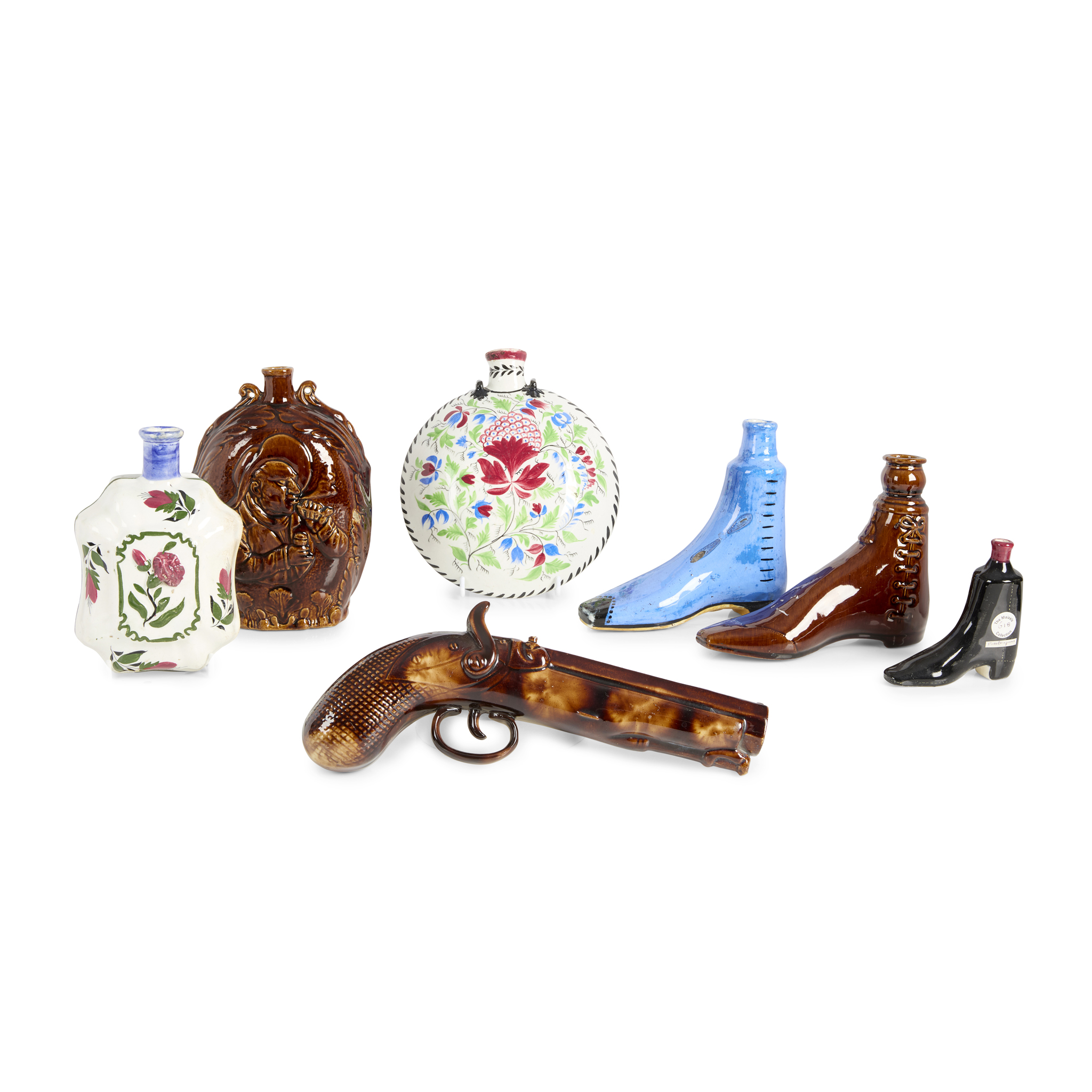 comprising three boot flasks, one blue glazed, one treacle glazed, one Prestonpans with black glaze; a treacle glazed flask in the form of a flint locked pistol; a treacle glazed flask moulded to each side with a man smoking a pipe; a round polychrome floral painted Kirkcaldy flask; and a moulded flask with polychrome floral decoration, possibly Scottish (7)