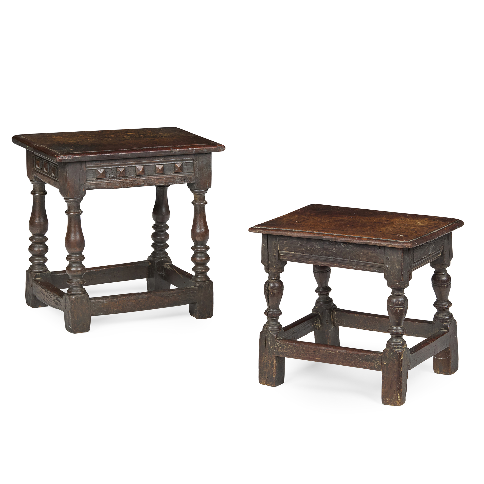 the taller example with two plank seat and moulded edge over a frieze of square studs, on four turned legs united by stretchers; the smaller example with a single plank seat and moulded edge over a moulded frieze, on four turned legs united by stretchers (2)
