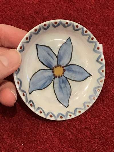 comprising a dish with pierced twin handles, painted by Elizabeth Mary Watts with fruits and branches, marked EMW 1923; a Mak Merry three piece cruet set on tray, painted with painted with summer flowers, painted mark MAK MERRY; a small squat Zoo pottery vase/bowl by William Miles Johnson, painted with birds and scrolling foliage, marked ZOO; a STUMP coffee cup and saucer painted with flowers on a sponged blue ground, signed STUMP LONGNIDDY; and a STUMP flower painted egg cup; a small Dresden round dish painted to the centre with a flower head on a lustre ground, marked Kilrenny; together with an earlier HAND PAINTED SMALL PLATE with concentric bands of decoration, marked to the reverse with a blue gate, R. H, dated 1881 and with a stylised flower motif (8)