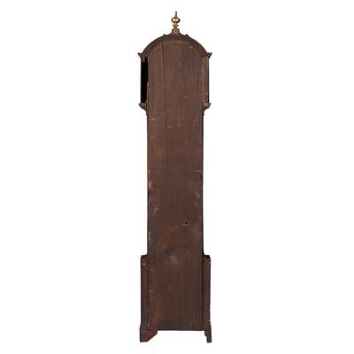 the 12 inch circular brass dial with silver chapter ring, Roman numerals and Arabic five minute markers, subsidiary second dial to the foliate engraved mask, signed ‘Jas. Mc. Gregor, Edinburgh’, the arched case with a centre gilt turned finial, the plain rectangular trunk door flanked by turned Doric quarter columns, on a square plinth base with bracket feet, the twin train movement striking a bell