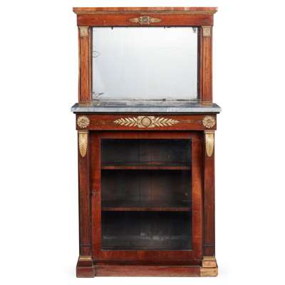 the moulded cornice above a mirrored recess flanked by flat pilasters with leafy capitals; the lower part with a grey marble slab above a glazed door and shelved interior, flanked by scroll columns with palmette mounts, on a plinth base