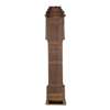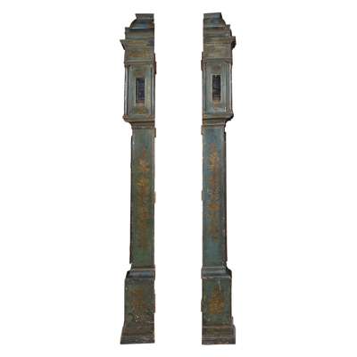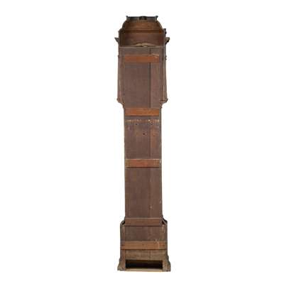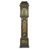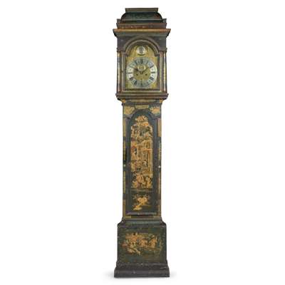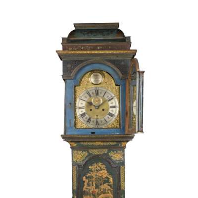 the 11 inch brass breakarch dial with silver chapter ring, Roman numerals and Arabic five minute markers, a subsidiary seconds dial and date aperture to the mask, with pierced foliate spandrels, the arch with a silvered signature roundel ‘Robert, Holland, London’ flanked by pierced dolphins, the domed caddy top case with moulded cornice, the dial flanked by Doric columns, the breakarch moulded trunk door on a square moulded plinth base, decorated throughout with blue and gilt lacquer panels showing figures in a palace and garden landscape, with a twin train movement
