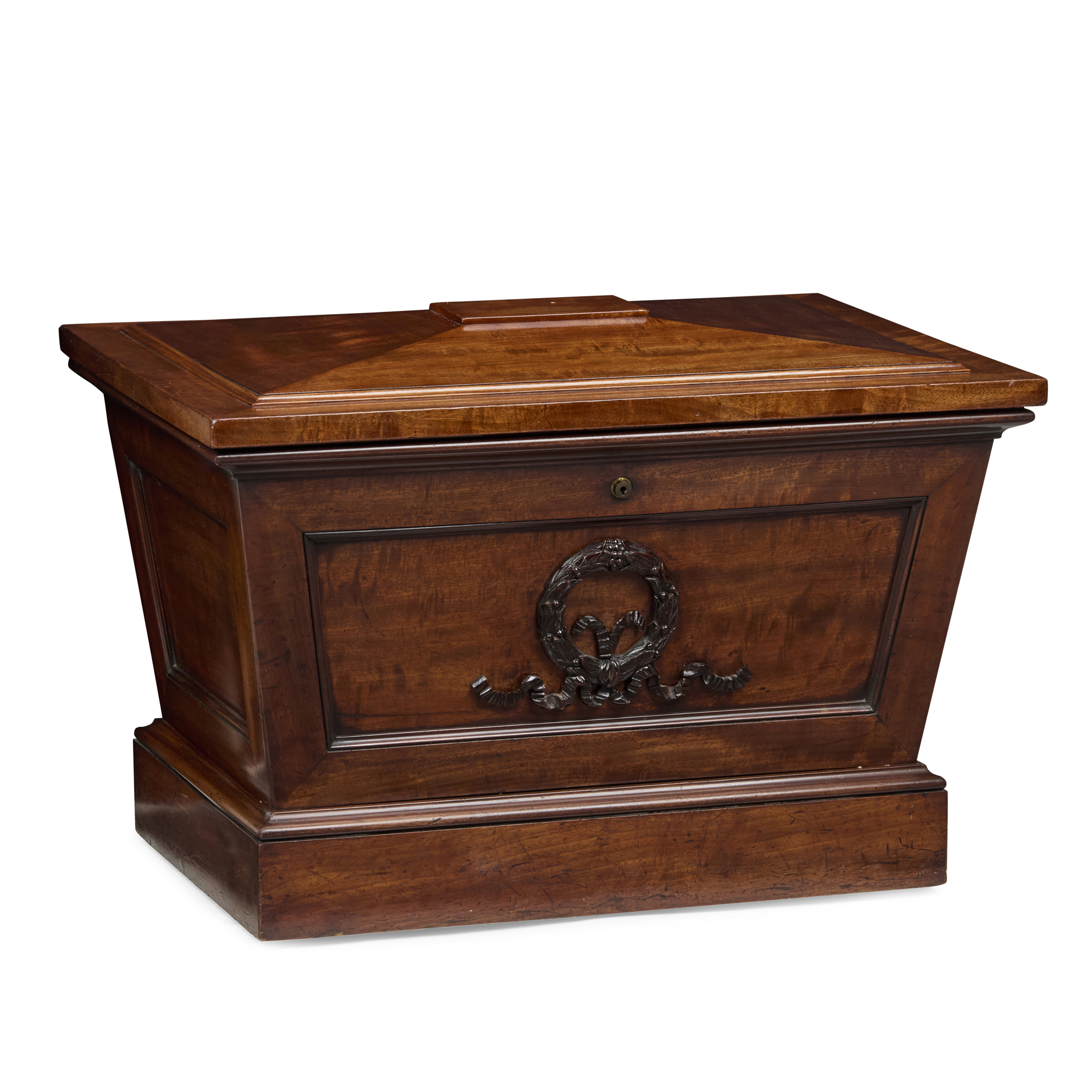 of sarcophagus form, the hinged top opening to a metal lined interior bearing an enamel trade label ‘W.J. MANSELL/ CABINET MAKER/ DEALER IN SUPERIOR ANTIQUE AND MODERN FURNITURE./ 266 & 266A FULHAM ROAD AND 20 REDCLIFFE GARDENS LONDON SW’, the front panel carved with a laurel wreath, on a plinth base with castors