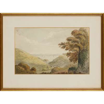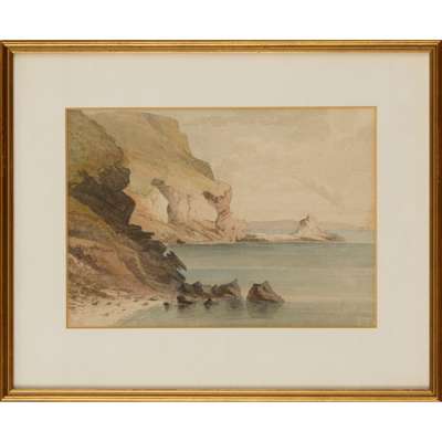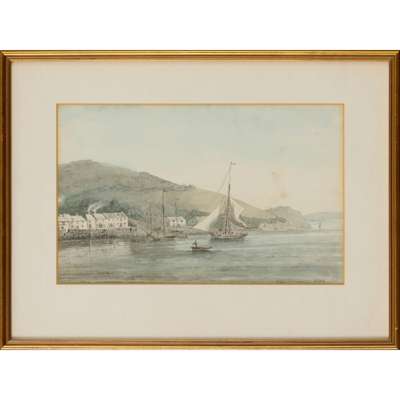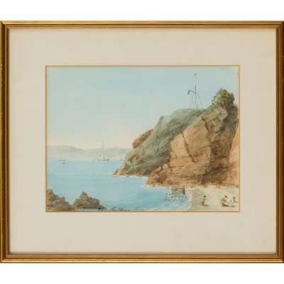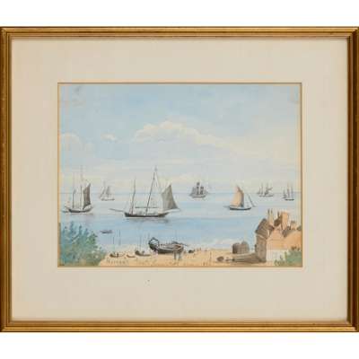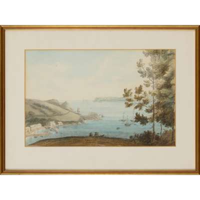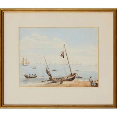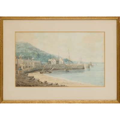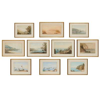 all coastal landscapes in watercolour, ink and wash on paper, including six Regency Views of Torquay, titled Pier at Torquay, Aug 1801; Torquay from the Warren, 1801; Anstey's Cove, Torquay, 1801; Torquay 1801; Torquay Harbour 1801; Babbacombe 1805; together with three William IV views of Lowestoft and Torquay, titled Lowestoft Sept 1836; Herring Boats, Lowestoft August 1834; Torquay 1833, Birthing Cove; and a panoramic view of a bay, all mounted in narrow gilt frames under glass (10)