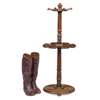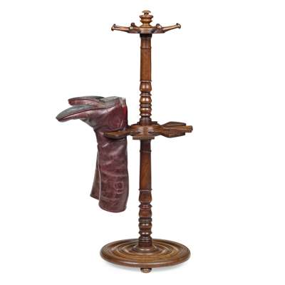 the turned central knop and column with whip spindles and a circular boot holder, on a circular base; together with a with a pair of leather riding boots