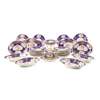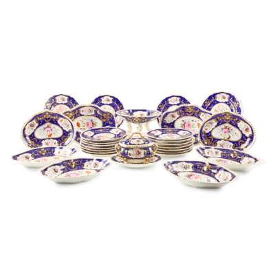 painted with panels of floral sprays within gilt borders, on a dark blue ground, the gadrooned rims with gilt highlights, comprising: eighteen plates, 22cm diameter; four lozenge-shaped dishes, 28cm wide; two cartouche-shaped dishes, 31cm wide; two heart-shaped dishes, 27cm wide; a comport; and a small sauce tureen and cover on stand, tureen 17cm wide; red printed factory mark of a crown over a D (29)