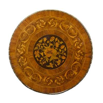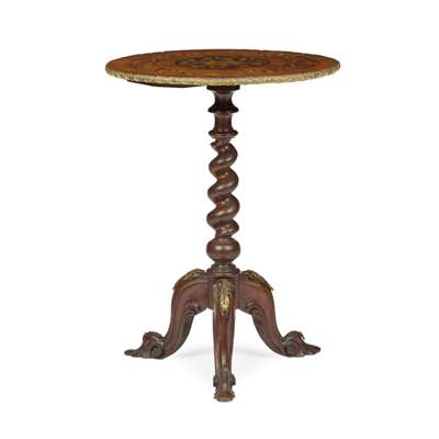 the circular crossbanded top centred by floral marquetry and a foliate band within a brass banded edge, raised on a spiral carved column and tripod base with cabriole legs with gilt metal mounts and ending in carved foliate feet