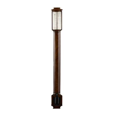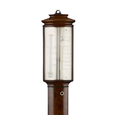 the bow-front case with silvered vernier scale from 27 to 31 inches and a thermometer, signed ‘H. Frodsham, Liverpool’, beneath a concave-moulded pediment, the base with ebonised urn-shaped cistern cover