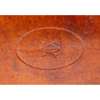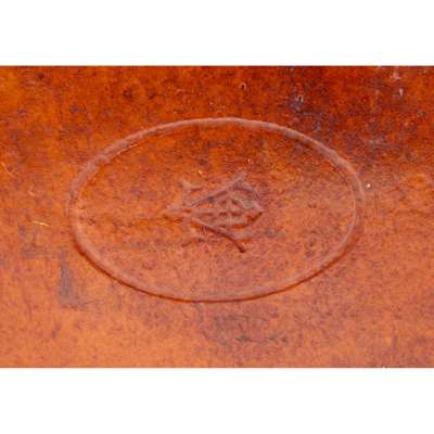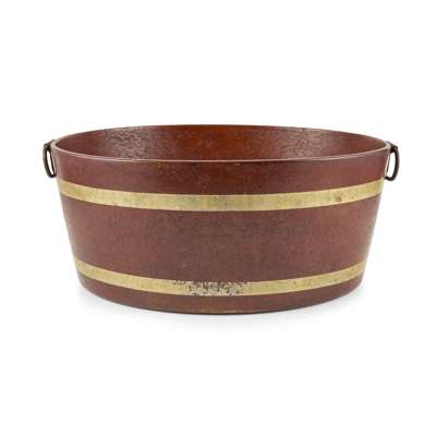 in the form of a wine cooler, with metal handles and gilt bands to simulate brass, the underside bearing embossed monogram ADT