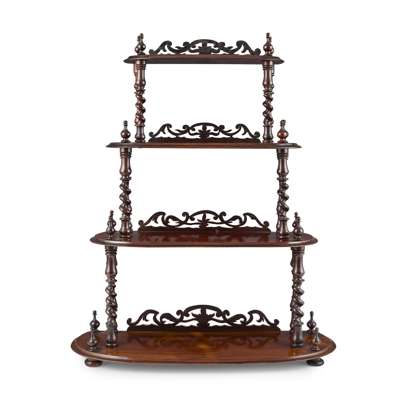 the oval graduated tiers with moulded edges raised and divided by spiral carved and baluster columns with turned finials, each tier with a pierced and scroll carved rear gallery, raised on bun feet
