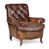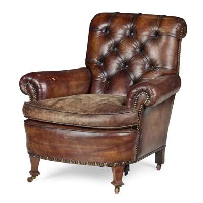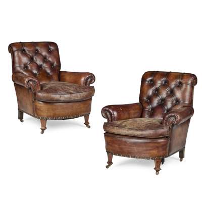 PAIR OF EDWARDIAN BROWN LEATHER UPHOLSTERED EASY ARMCHAIRS