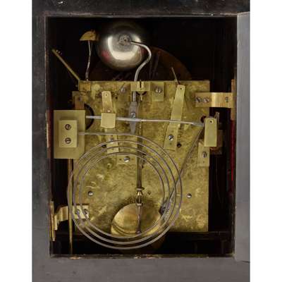 GEORGIAN STYLE EBONISED AND GILT BRASS QUARTER STRIKING AND CHIMING TABLE CLOCK