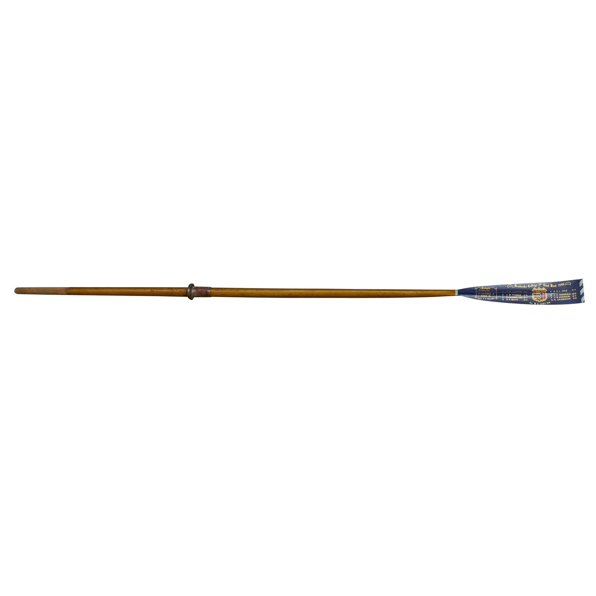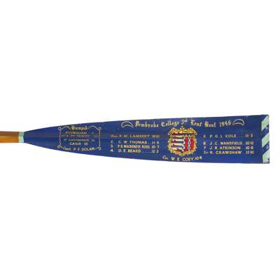 won by P B Mackenzie Ross, No.3 Seat, 'Pembroke College 3rd Lent Boat 1946', and made by Ayling & Sons, Vauxhall, London, the full length blade with paddle painted with the race and competitors that won