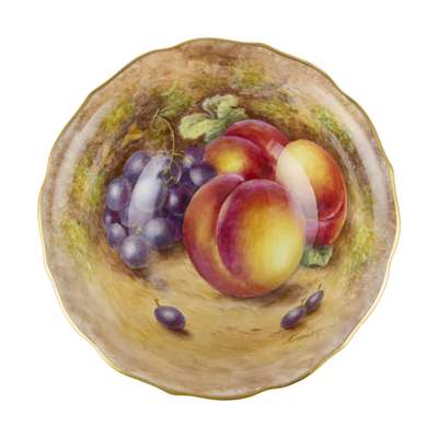 painted to the interior with peaches and black grapes on a mossy ground, and to the exterior with further fruits including peaches, grapes, cherries and a pear, with a scalloped gilt rim; signed, black printed factory mark
