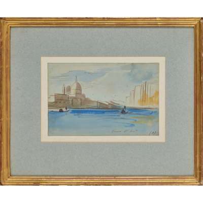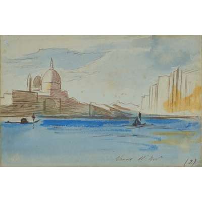 After a first visit to Venice in 1857, Lear returned in November 1865 to make studies for a commission of an oil painting he had received from Lady Waldegrave. His diary entry for 13th of November indicates the artist's engagement with the view of Santa Maria della Salute at that time, and reads as follows: 'Had a cup of café noir in the Hotel - & then got a gondola for the day. First drew S[anta] M[aria] de S[salute] by the Doge's Palace -then from the Iron Bridge... but it was very cold'.