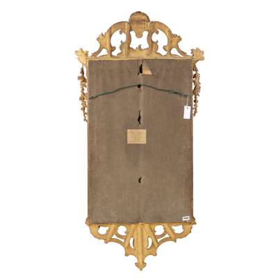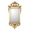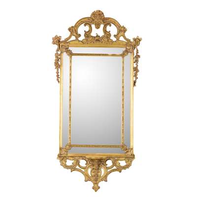 the bevelled rectangular mirror plate with four margin plates inside a moulded gilt frame, with a scalloped c-scroll pediment with floral trails, the similar base with a small bracket